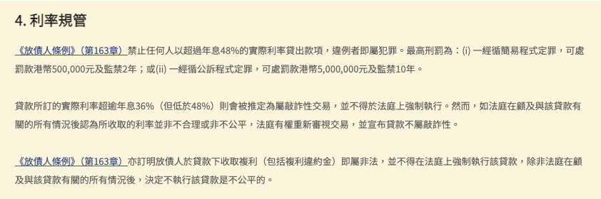 《放債人條例》(第163章)禁止任何人以超過年息48%的實際利率貸出款項,違例者即屬犯罪。